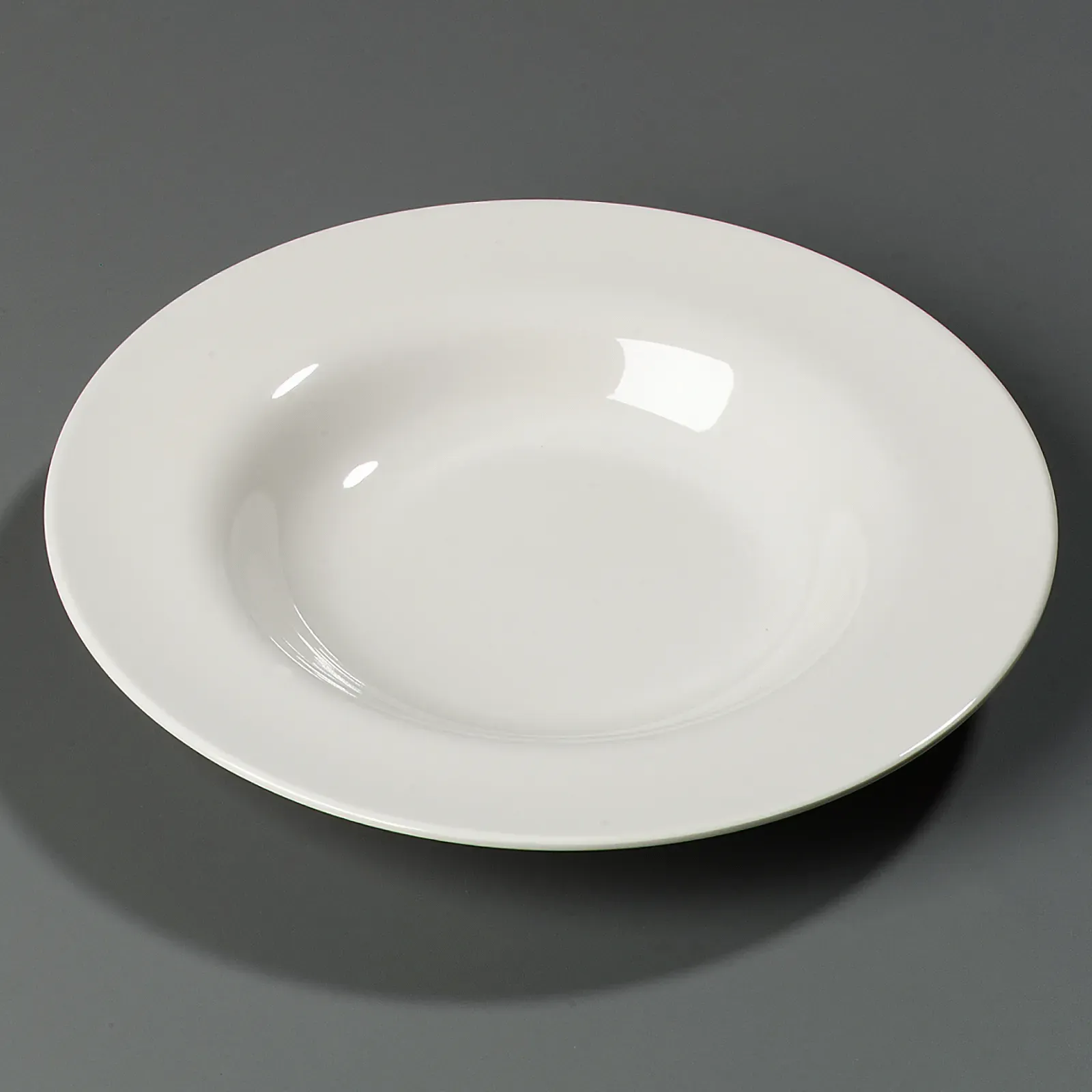 Introducing the Carlisle 3303042 Soup Salad Pasta Cereal Bowl, a must-have for any commercial restaurant. With its superior design and functionality, this bowl is perfect for serving a variety of dishes. Made from durable melamine, it is dishwasher safe and resistant to drawing heat or cold from food, ensuring that your meals stay at the perfect temperature. The elevated foot design adds an elegant touch to your presentation, while the bone color adds a touch of sophistication to your table setting. With a capacity of 20 oz. and a 12" diameter, this bowl is ideal for serving generous portions. Trust Carlisle to deliver quality and style to your restaurant.