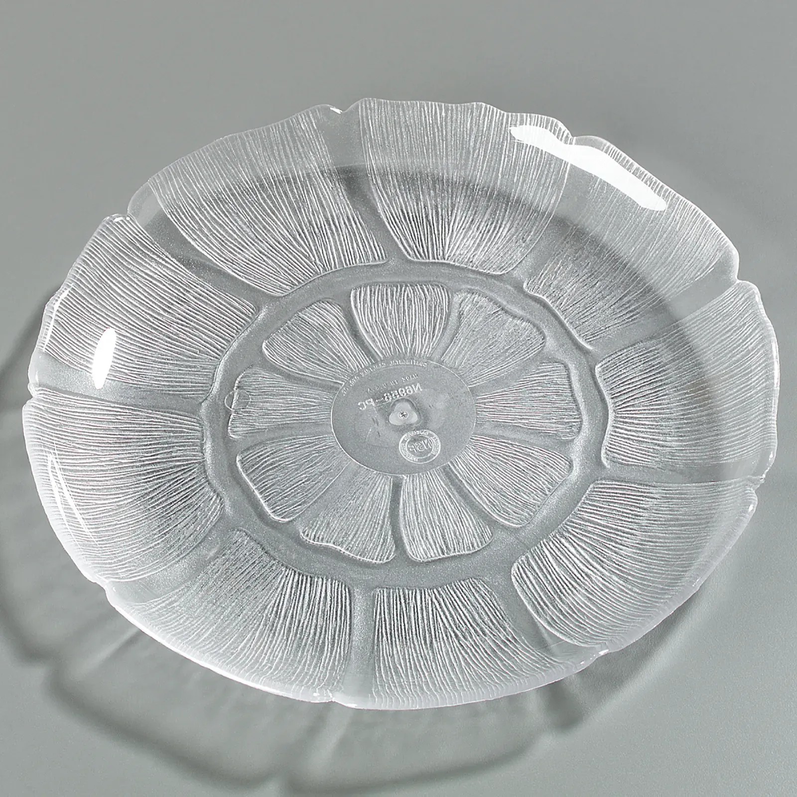 Equip for success with essential tools like the Carlisle 695607 Plate. Designed for commercial restaurant use, this plate is a must-have for any foodservice establishment. With its textured exterior and smooth interior, it offers a unique and stylish presentation for your culinary creations. The scalloped edge adds an elegant touch, making it perfect for upscale dining experiences. Made from break-resistant polycarbonate, this plate is built to withstand the rigors of a busy kitchen, ensuring long-lasting durability. It is also dishwasher and freezer safe, providing convenience and versatility. The clear design allows for easy visibility of the food, enhancing the overall dining experience. NSF certified and recyclable, this plate meets the highest standards of quality and sustainability.