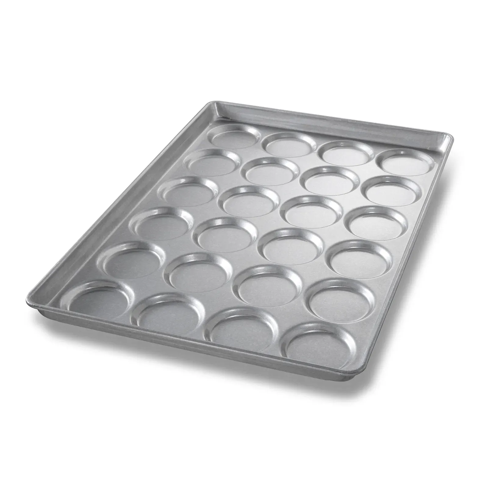 Upgrade your commercial restaurant kitchen with the Chicago Metallic 42495 Loaf Pan. Crafted with 26 gauge aluminized steel, this pan is built to withstand the demands of modern cuisine. Its 17-3/4" x 25-3/4" x 1-1/3" size and (24) 3-3/4" round compartments make it perfect for baking delicious hamburger buns. The wire-in rim ensures durability and even heat distribution for consistent results. Hand wash recommended for long-lasting performance. The AMERICOAT ePlus silicone glaze provides a non-stick surface, making it easy to remove buns without any damage. Plus, it's PFOA free, ensuring the safety of your customers and staff. With its high-quality construction and user-friendly design, this loaf pan from Chicago Metallic is a must-have for any commercial restaurant. Upgrade your baking game today!