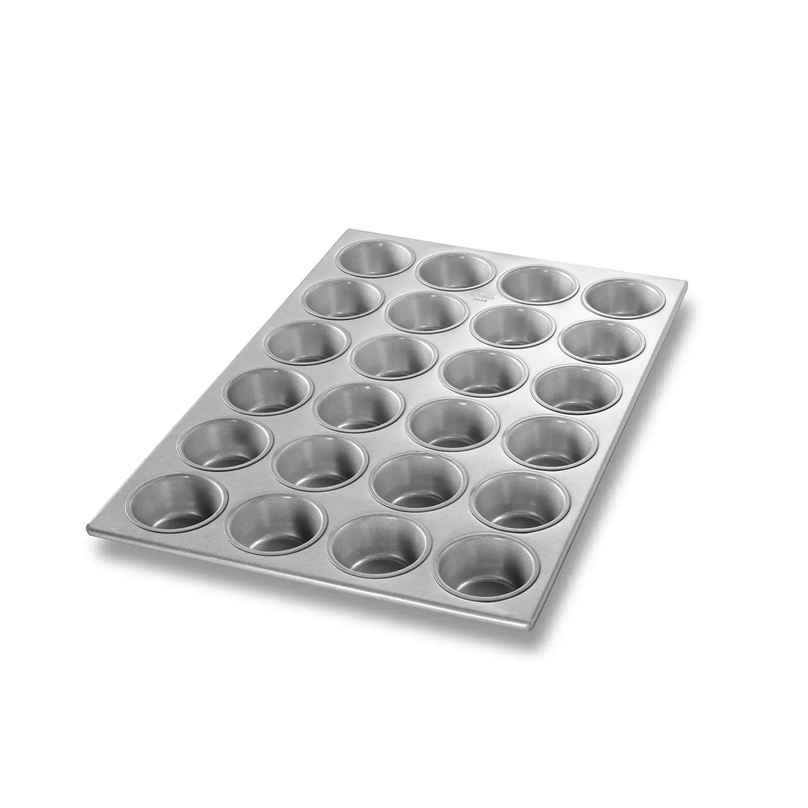 Introducing the Chicago Metallic 45525 Muffin Pan, a must-have tool for commercial restaurants. This high-quality pan is designed to meet the demands of a busy kitchen, ensuring consistency with diverse, quality tools. Made with durable aluminized steel, it features a wire-in rim for added strength and stability. The 22-gauge panel and 26-gauge cups provide even heat distribution, resulting in perfectly baked muffins every time. With a capacity of 3.8 oz. each, this pan can make 24 delicious 2-3/4" diameter cupcakes in one go. The AMERICOAT ePlus silicone glaze ensures easy release and quick cleanup, while being PFOA-free for added safety. Hand wash recommended. Whether you're running a bakery or a restaurant, the Chicago Metallic 45525 Muffin Pan is a reliable and efficient tool that will elevate your baking game.