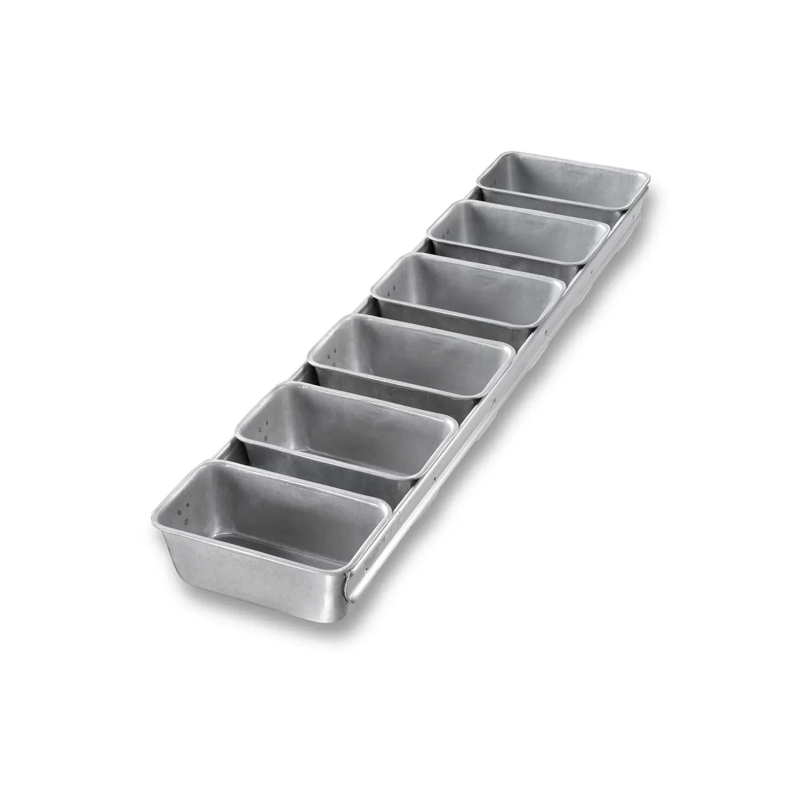 Stay ahead in the culinary landscape with the Chicago Metallic 46925 Loaf Pan. Designed for commercial restaurant use, this bread pan set includes six 5-5/8" x 3-1/8" strapped pans, providing ample space for baking multiple loaves at once. Made from durable 26 gauge aluminized steel, these pans feature a seamless design with a curled rim and large radius corners, ensuring even heat distribution and easy release of baked goods. The AMERICOAT ePlus silicone glaze not only enhances the pan's non-stick properties but also makes it PFOA-free, promoting healthier cooking. Hand wash recommended for long-lasting performance. With its high-quality construction and convenient strap under pan rims, this loaf pan set from Chicago Metallic is a must-have for any commercial kitchen. Elevate your baking game and impress your customers with perfectly baked loaves every time.