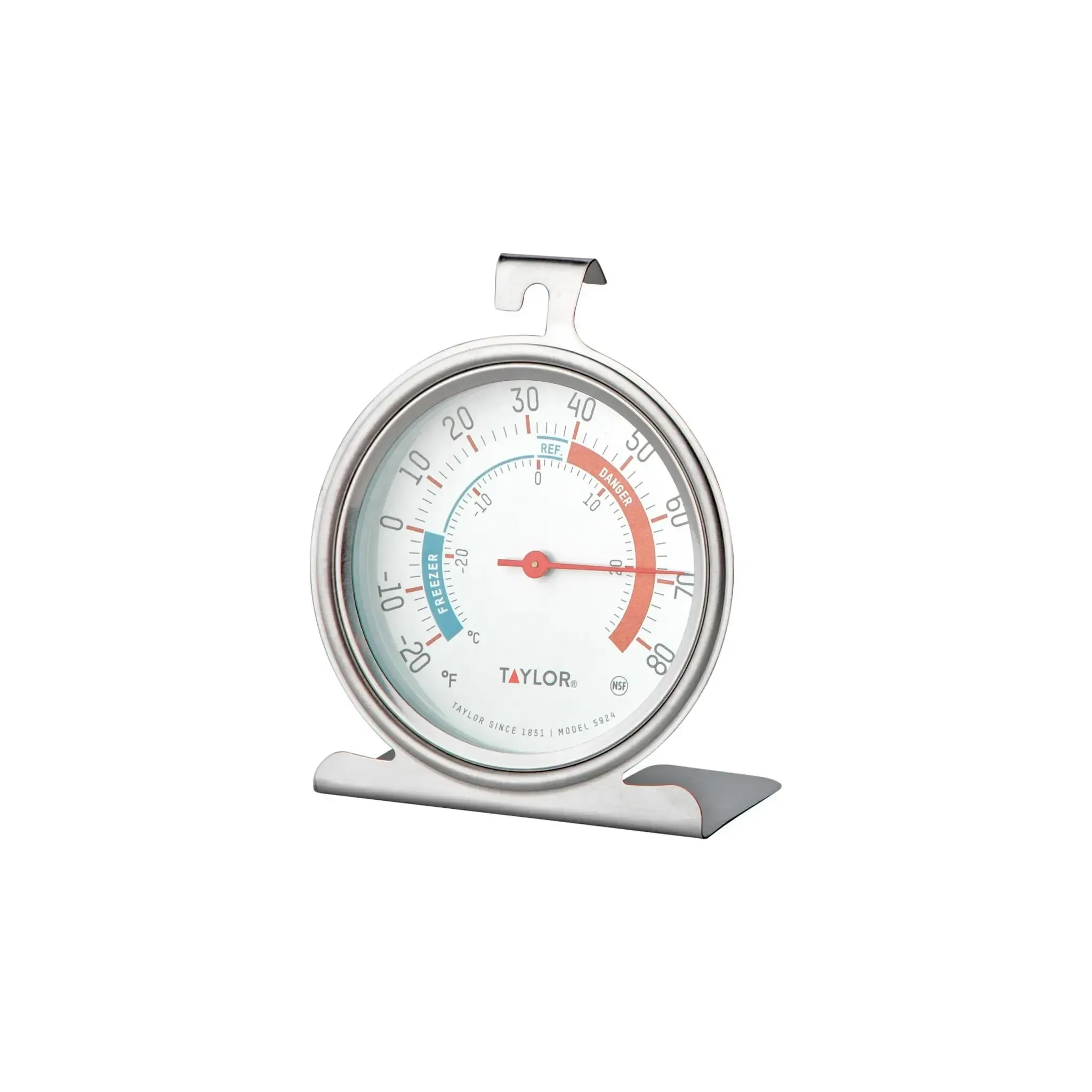 Transform solutions with the Taylor Precision, 5924, Thermometer, Refrig Freezer. This refrigerator/freezer dial thermometer is a must-have for any commercial restaurant. With a temperature range of -20º to 60º (-30ºC to 30ºC), it ensures that your perishable items are stored at the optimal temperature to maintain freshness and prevent spoilage. The 3" dial face is easy to read, allowing you to quickly monitor the temperature at a glance. Made of stainless steel, this thermometer is durable and built to withstand the demands of a busy kitchen. It can be hung or stood up, giving you flexibility in where to place it for easy visibility. The safe temperature zone indicators provide a visual cue to ensure your food is stored at the correct temperature. NSF certified, this thermometer meets the highest standards of quality and safety. Don't compromise on food safety - equip your restaurant with the Taylor Precision, 5924, Thermometer, Refrig Freezer.
